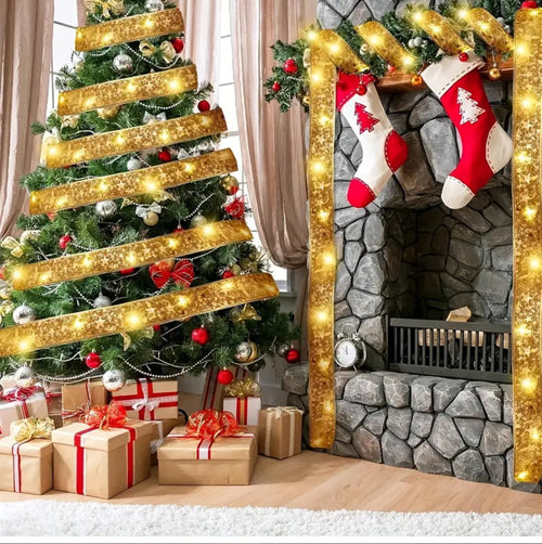 LED Christmas Tree Ribbon Light | 1.97 Gold Sparkling Wave Design | Battery Powered, No Plug Required I Holiday Decorations for Christmas and Weddings | Santa Theme Glitter Embellishments, Christmas Tree Lights